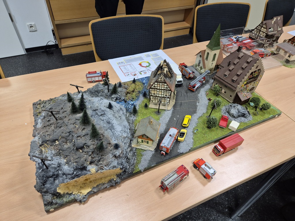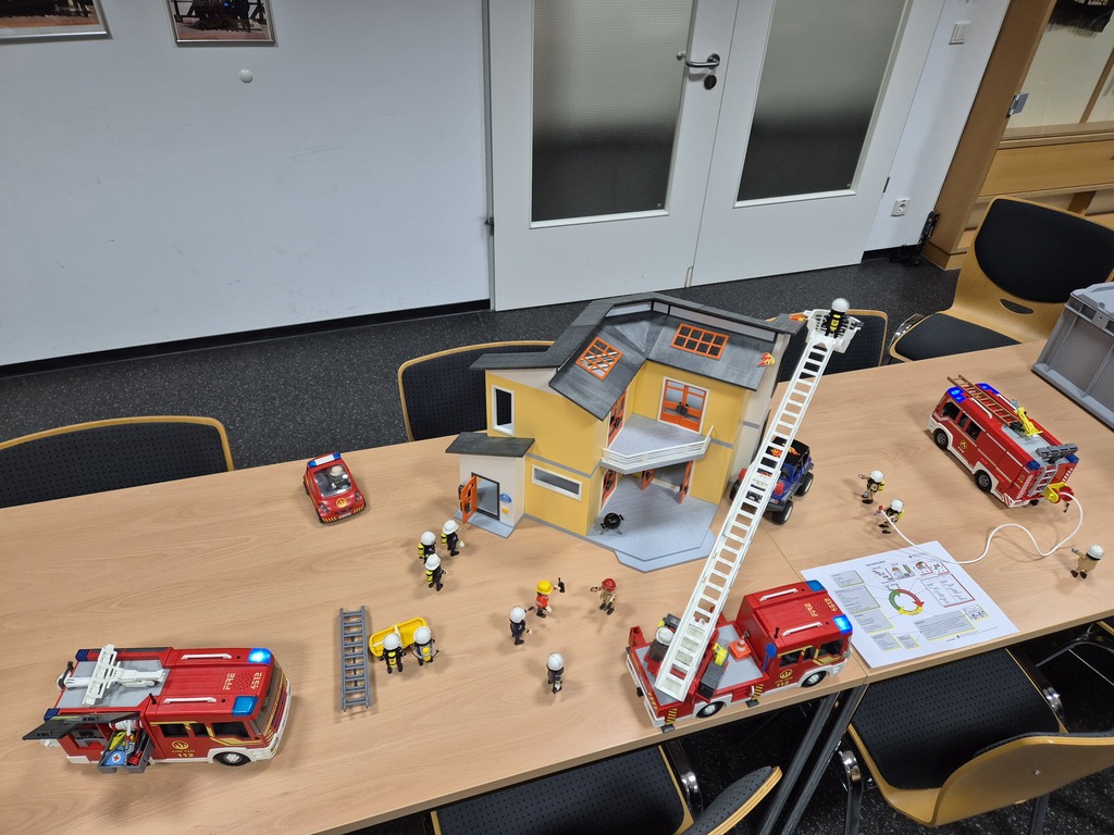 Im praktischen Teil wurden Planübungen zur Brandbekämpfung durchgeführt. Mithilfe einer Modellbauplatte und eines Playmobil-Löschzugs konnten realistische Szenarien dargestellt werden. Zwei Übungsaufgaben boten Gelegenheit, das vermittelte Wissen anzuwenden und zu festigen.