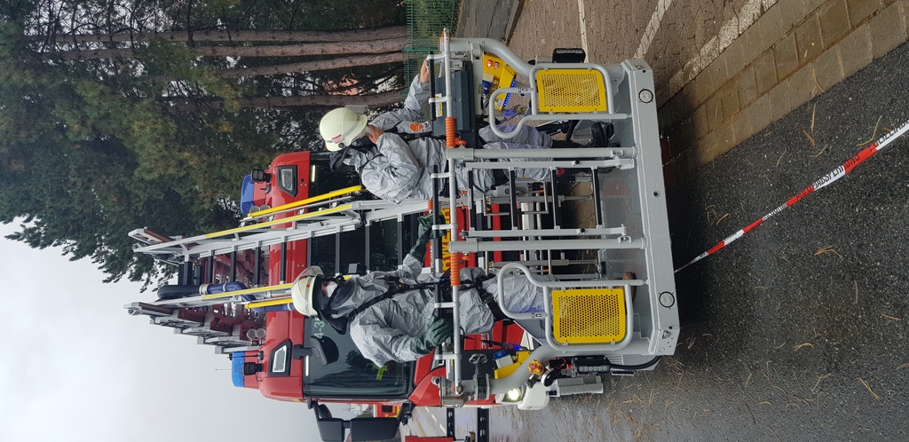 Im Anschluss kontrollierte die Feuerwehr mittels Drehleiter mehrere Platten und sicherte die lose Dämmung mit Schrauben. Da es sich bei den Platten um Asbestprodukte handeln konnte, musste die persönliche Schutzausrüstung mit Einmalanzügen, Handschuhen, Gummistiefeln und Masken ergänzt werden. Die defekte Platte wurde von einem Hausmeisterservice aufgenommen und im Anschluss fachgerecht entsorgt. Einsatzende war um 09:50 Uhr. Während der Arbeiten an der Hausfassade musste, die Rehrbrinkstraße voll gesperrt werden.