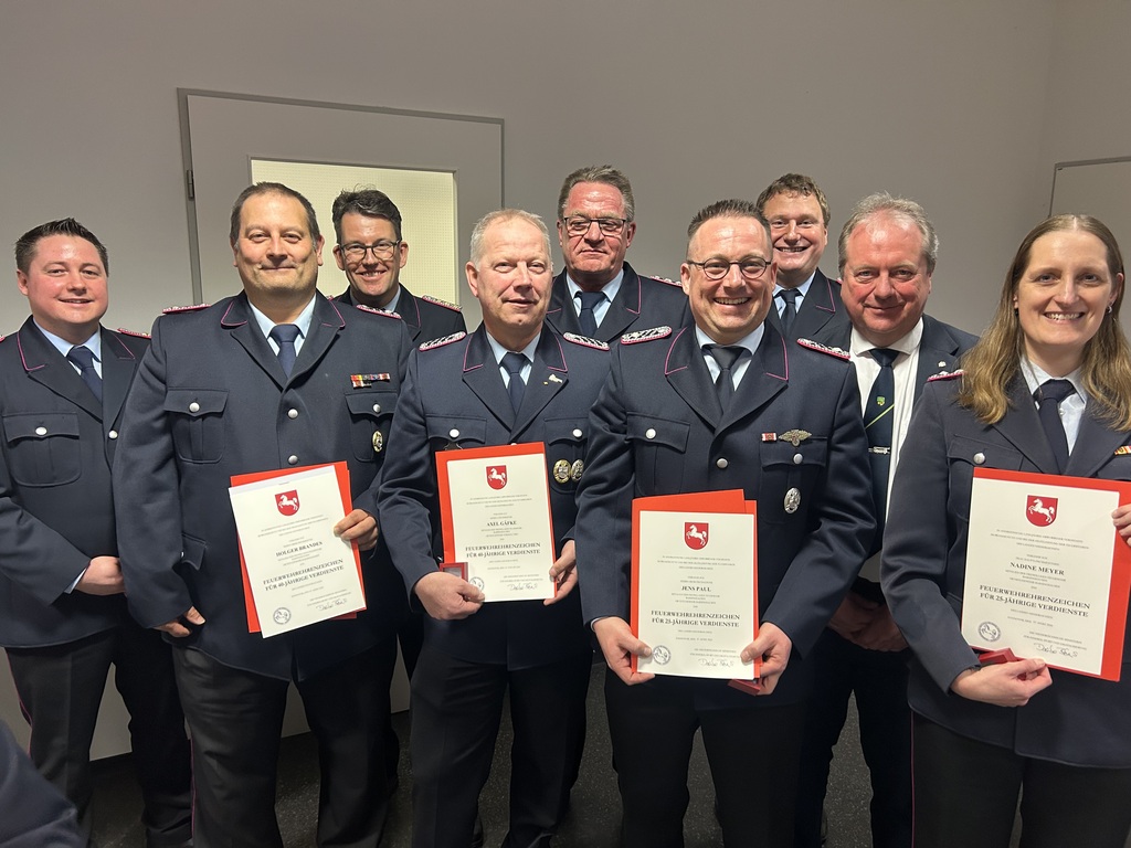 Für langjährige aktive Mitgliedschaft in der Ortsfeuerwehr Barsinghausen für 25 Jahre Rene Braun, Nadine Meyer, Jens Paul; für 40 Jahre Holger Brandes, Axel Gäfke und für 50 Jahre Ralf Helle.