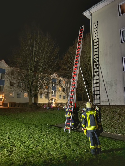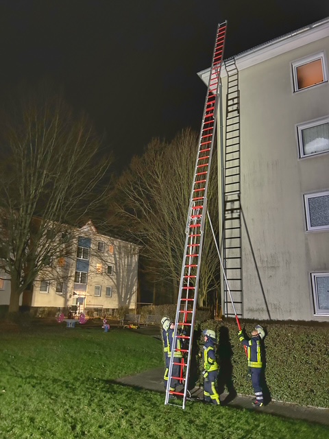 Im praktischen Teil der Übung wurde das zuvor Besprochene an einem Objekt in der Wilhelm-Busch-Straße umgesetzt. In mehreren Durchgängen übten die Trupps das korrekte In-Stellung-Bringen der Leitern, das sichere Besteigen sowie das Arbeiten von der Leiter aus. Besonderes Augenmerk lag auf der Zusammenarbeit im Trupp, der Kommunikation sowie der Einhaltung aller Sicherheitsregeln. Zusätzlich wurden verschiedene Einsatzszenarien simuliert, um den Umgang mit den Leitern unter möglichst realistischen Bedingungen zu festigen.