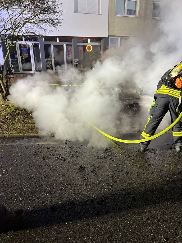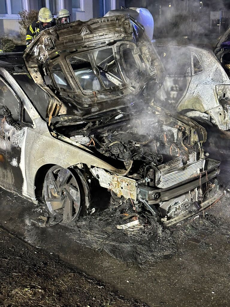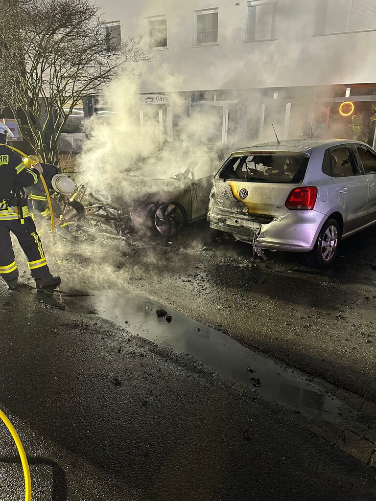 Beim Eintreffen der Einsatzkräfte stand ein Pkw bereits in Vollbrand. Ein daneben abgestelltes Fahrzeug hatte ebenfalls Feuer gefangen.
